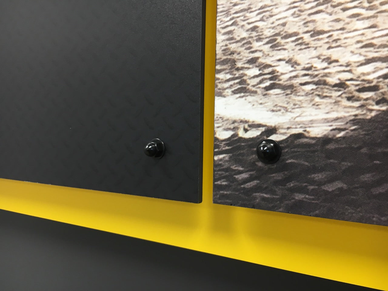 These visual signs design to be placed within the office environments come in a limitless combination of product imagery and motivational messaging. Each complete sign assembly is composed of three panels built with decorative steel hardware: