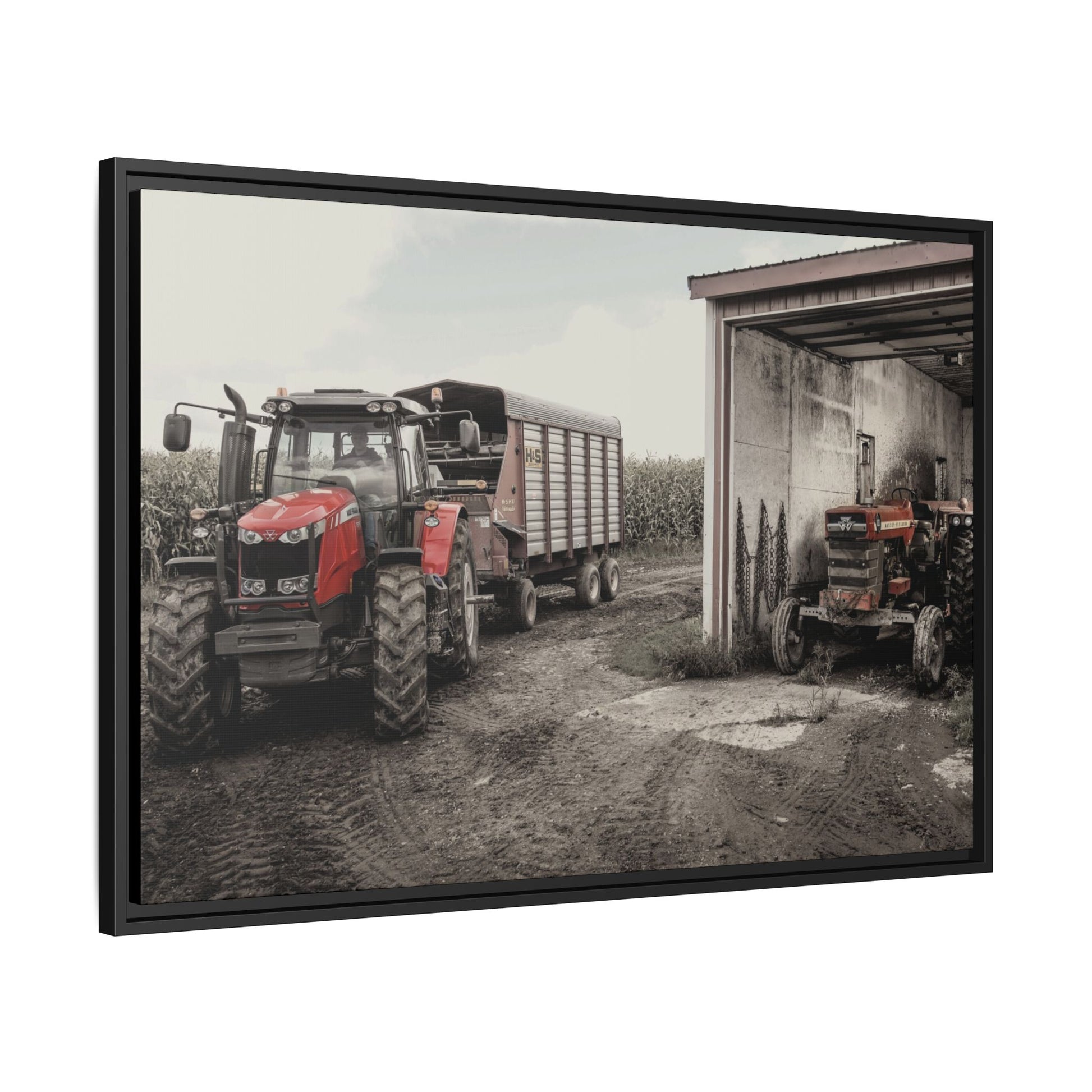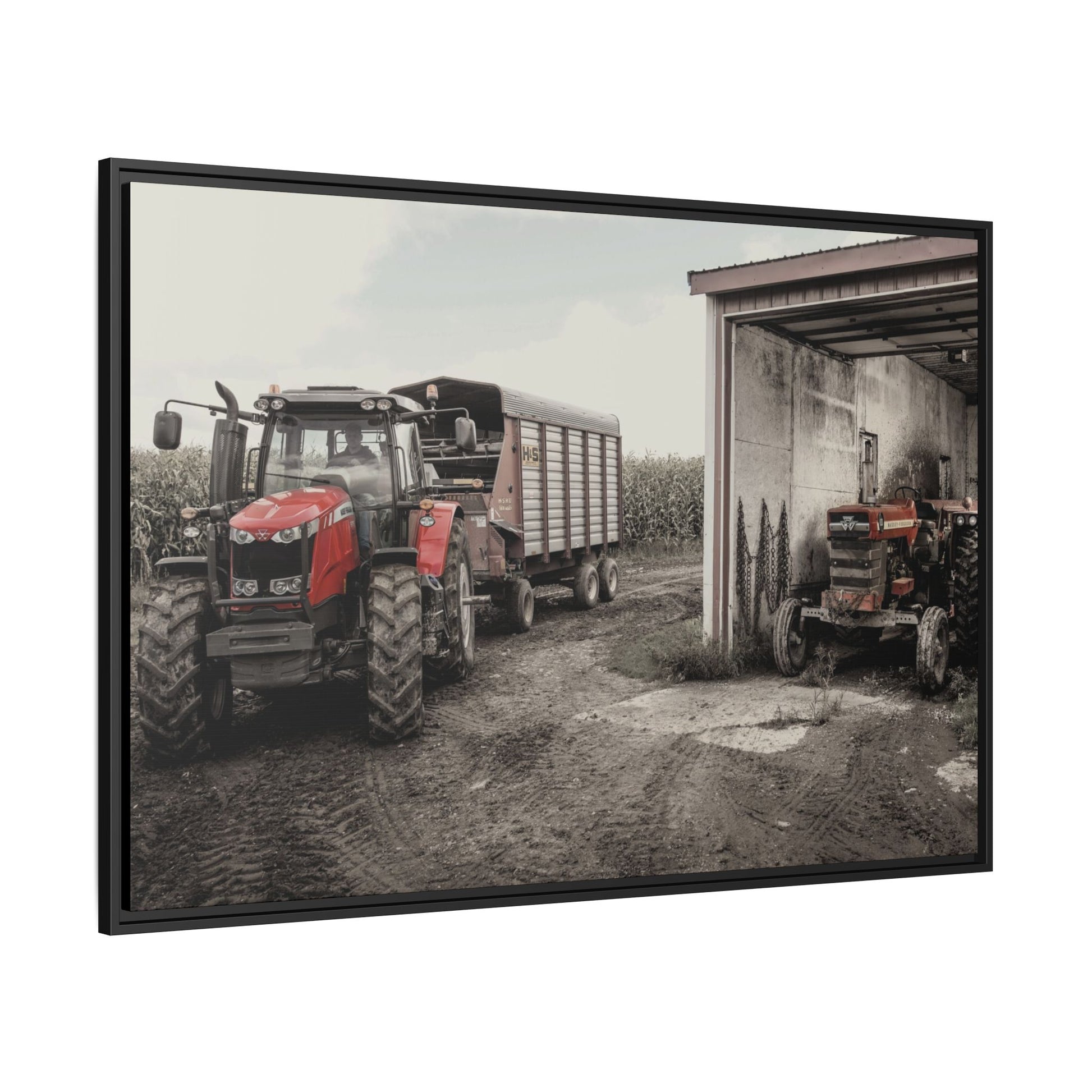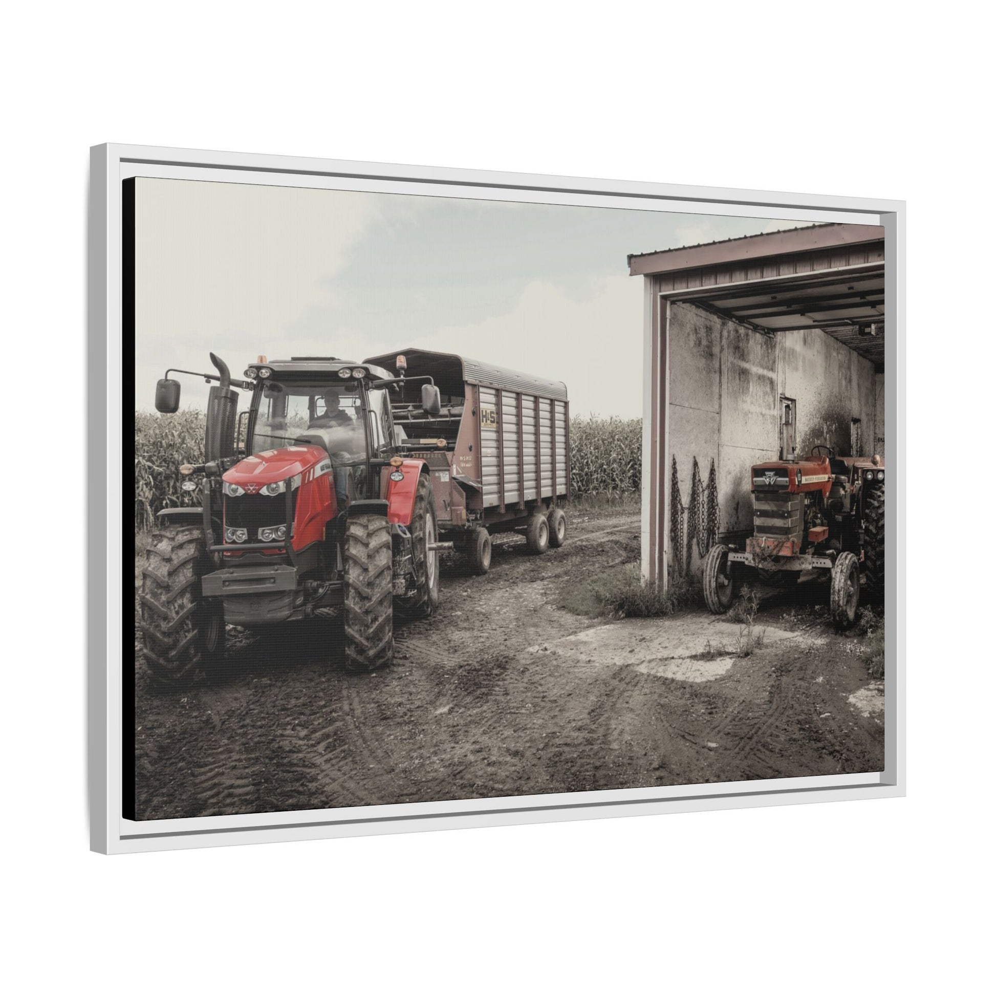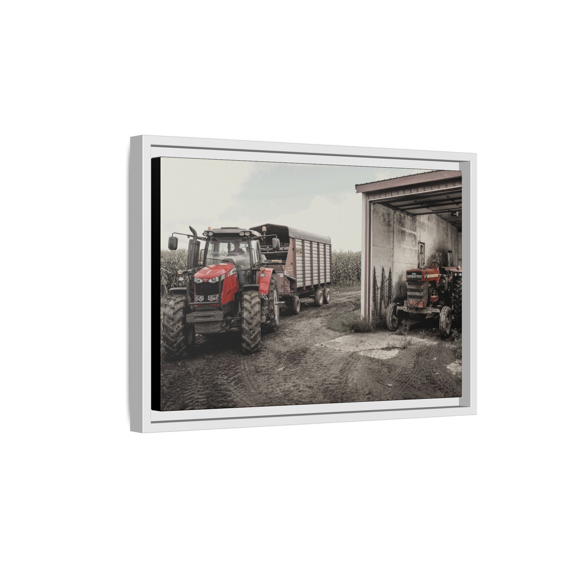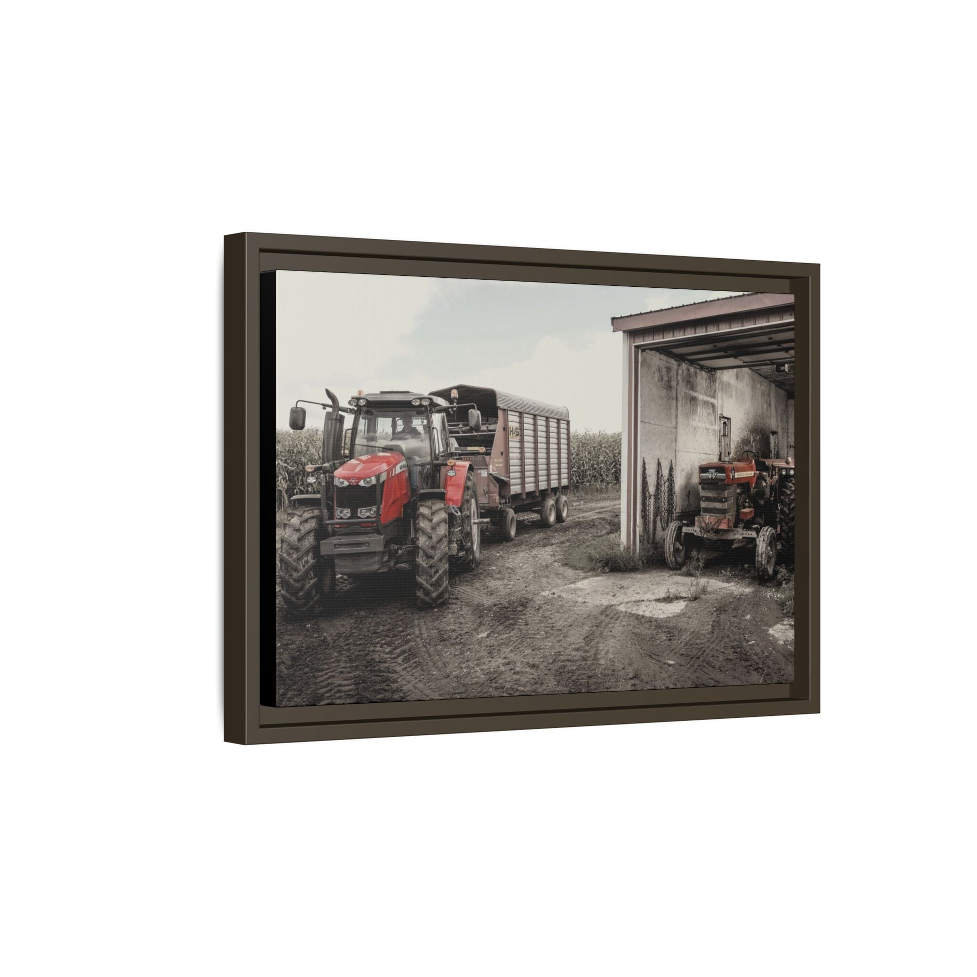 Our framed matte canvas classic machine photos have been created to match the industrial, rustic aesthetic of your environment. Our Vintage Collection is a great supplement to any dealer showroom, board room, break areas, or even your own Massey Ferguson tribute showcase! The pine wood frame and matte finish keep reflections low and colors deep, so the image reads clearly from across the room. Choose a size and frame color to match your space.